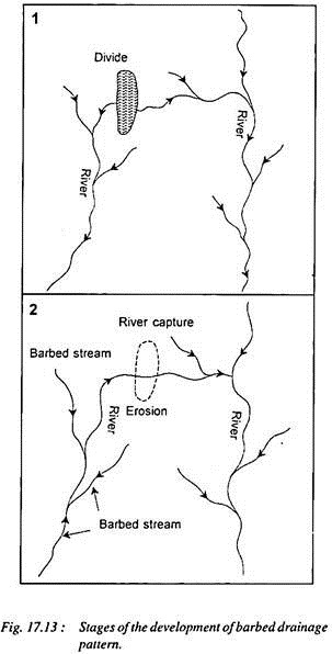 Barbed drainage pattern, a rare kind of drainage pattern, is formed when the tributaries flow in opposite direction to their master streams. The tributaries join their master streams in a hook-shaped bend. Such pattern is generally developed due to river capture (fig 17.13).